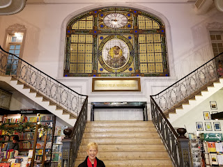 Inside of an old theater they have set up a bookstore. It's very cool and elegant and up on the top floor overlooking the street is a Café. Leslie and I were able to enjoy tasty warm at mushroom salads with cheese and greens and vinaigrette. We were able to watch the street go by and listen to a man playing violin out on the street. Was a great way to have a nice lunch. The street that we were looking out at has Uruguay's Walk of Fame. Little Suns with people's names on it that we got to explore. However this is not the Enrique Iglesias we thought he was!