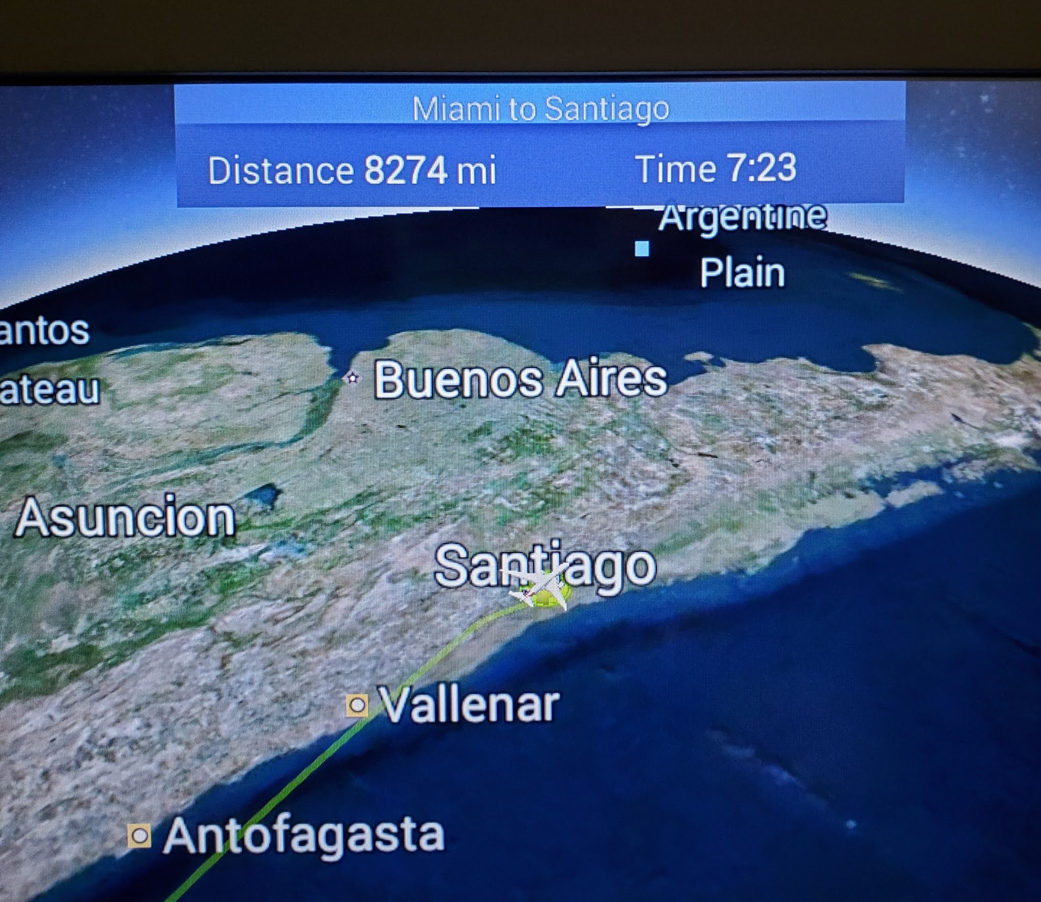We have arrived!  It was not easy getting here to say the least.  There were the normal issues, the drive to Miami, checking in a bag and going through security.  We used our points to fly first class so we went through the priority gate at the security area.  We were not sure that it was any faster than the regular screening area.  After stripping off my belt, my shoes and removing my computer and hat I was deemed safe to proceed.  We made a bee line to the 1st class club but the attendant told us that we really should be at the flagship lounge.  So we turned around and walked the 18 gates to the flagship lounge.  We enjoyed a relaxing sip of champagne, given to us at the door of the lounge, and took a load off of our feet.  After a couple of hours we started back.  We were going to take the sky train back to our gate but the elevator was kaput so we walked 22 gates to our gate.  It is no wonder that my step counter topped off at 14,000 steps.  But once I got seated in my pod I was ready for a long sit down.  The flight was 4134 miles but the display said it was 8000 miles?  Once we landed there were the new hurdles for us to jump over.  As I mentioned in the last post there is a whole new set of barriers to travel due to Covid.  American Airlines needed us to submit a series of documents through an app called VeriFly.  These included our Vaccine info, an affidavit for the Chilean Government, a recent PCR Covid test.  That is allot of scanning and uploading.  We then had to present all of this plus proof of travel insurance when we landed in Chile.  However this was after a 8 hour night flight where we were lucky to have two or three hours of sleep between the two of us.  There was a bit of a hiccup on our affidavit but we resubmitted those on the spot and we were allowed to proceed down the line.  The next stop was another PCR test.  We lined up with the other passengers and when it was our time we were probed with some primitive Q-tip style weaponry!   I was aware that the human brain is just a few centimeters behind the nasal cavities, I was not aware that the test administrators were actually going to drive the sampling Q-tip into my brain.  Woof! The policy in Chile is, if the traveler can pass a PCR test upon arrival they do not need to isolate.  It was a small price to pay to skip 5 days of quarantine.  We got though customs but had to surrender the fruit that we took off of the plane.  We got to our driver who took us to the AirBnB.   But we still had to wait 6 hours for the PCR test results to get posted.  We tested negative and got the results with a QR code so now we are golden.  We have our mobility pass and proof of multiple negative tests.  We celebrated by walking down to the Jumbo market and got breakfast food, beer, wine and a chicken for dinner.  It will be an early night for us most certainly due to the lack of sleep on the plane.  Tomorrow will be a new day for these travelers.