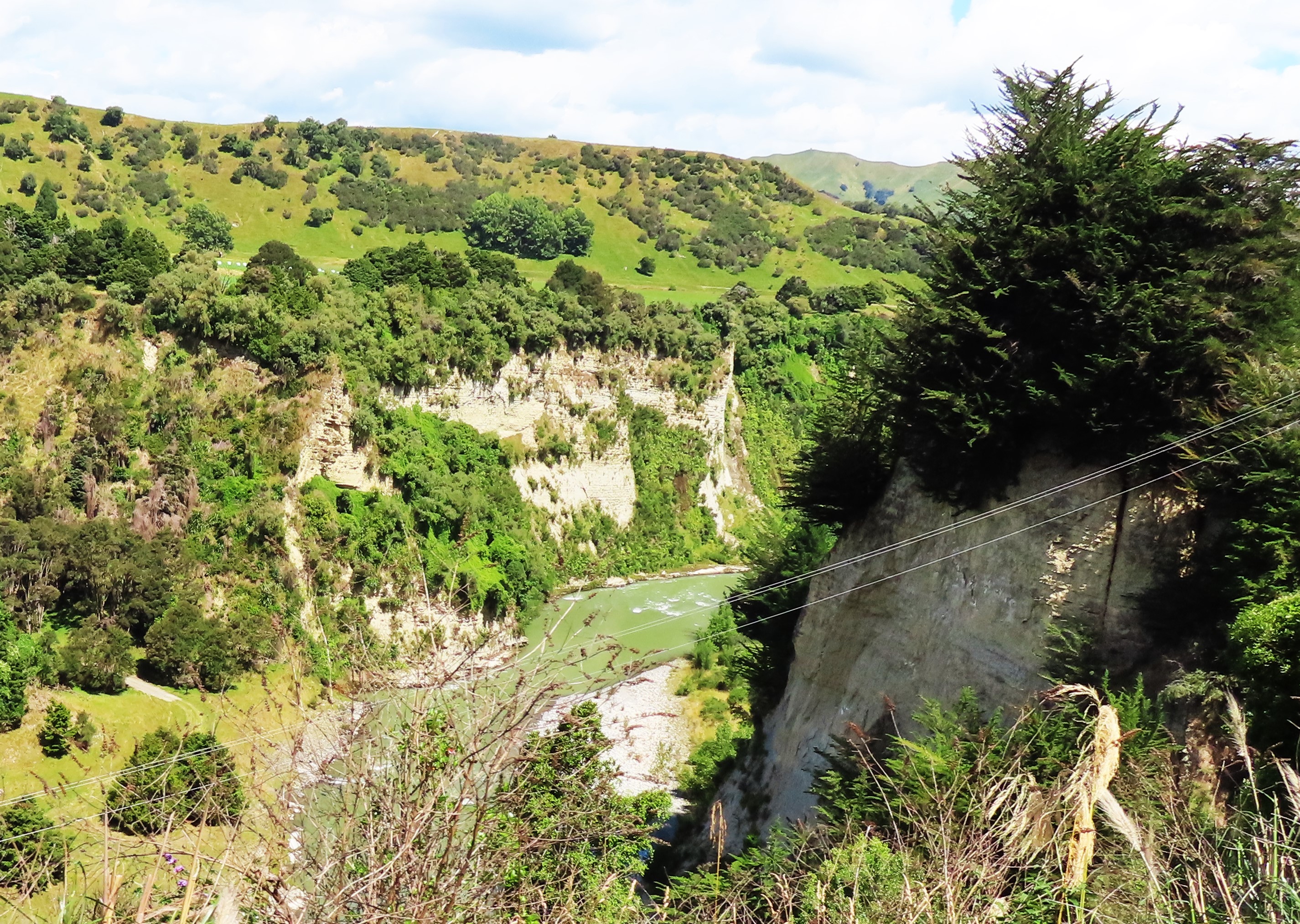 This train trip took most of an entire day. We spent some time in the morning at the Chateau playing snooker and getting lunch. We got to spend some time talking with Alok. He was the guy who helped us with our luggage and he is a kindred spirit. A fellow traveler who came from Vancouver to New Zealand for work and has many travel plans. We boarded the train at 1:15 after talking with Joseph from Sydney for an hour. This time there were more people getting on the train that at Otorohanga. Our seats were OK but we spent more time in the viewing carriage than in our seats. The viewing carriage was open to the elements and smelled a bit of diesel but it was grand fun. We had dust and bits of vegetation all over our windblown selves. The path was generally downhill and we had another spiral system to travel through. Once we broke out of the river valleys and we could see the sea, we knew our ride was coming to a close. We were almost an hour late due to and engine change in Palmerston North and the speed restrictions on the new section of track. The new track was put down to fix the track that was washed out by Cyclone Hale last week.