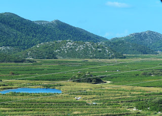 At 10 AM, our driver passed right by us while we were waving to him from the side of the road. He drove 200 feet uphill and parked. This was not going to work for us. After telling him this, he first tried to turn the van around and drive back the wrong way. Then he said he would carry all the luggage up there, which we declined. Finally he backed down to where we had been standing all along. When we got loaded, we had to drive a narrow one lane road that climbed the mountain behind Dubrovnik. There were many switchbacks and eventually he turned left where there was a not left turn sign. The coast drive was amazingly beautiful with small and medium sized towns perched along the sea. We drove over the huge 2.4 km long bridge that cost more than 500 million Euros to build. It connected parts of Croatia that were cut off by a strip of Bosnian territory. Then we drove through the vast Nereta River delta that is very fertile and liked with orange trees. Our driver stopped and bought is a bag of oranges. More rugged mountains lined the road as we traveled a total of three hours to get to Split.