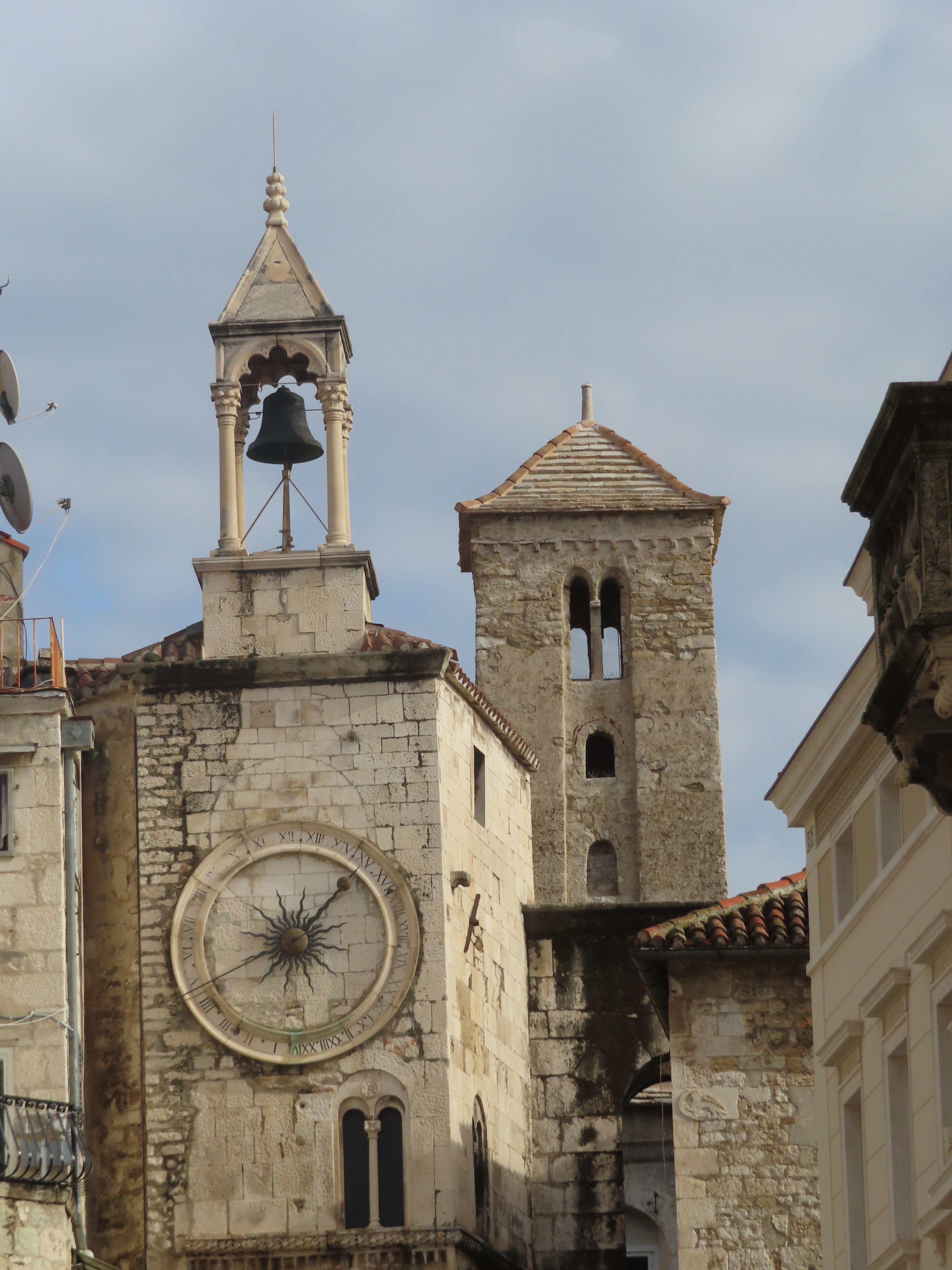 After surviving the climb to the belltower we headed over to the Baptistry. The entrance was a very detailed stone structure. Two large green doors were closed and securely locked. This was unexpected since we paid extra just to be able to visit this. Luckily the ticket booth was close by so we went to inquire. Thinking that a refund was in order, we were surprised when one of the counter agents reached into a drawer and pulled out a very large key. She then walked with us to the door and unlocked it. She stood outside while we looked, took pictures and read the plaques. This building was originally the Temple to Jupiter build between 295 and 305 CE but it was converted from its Pagan origins to a christian baptistry in the 7th Century. The sarcophagi of a few Split Archbishops were outside the temple.