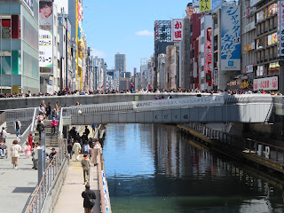 The sun was shining so we took advantage of the light and warmth to head out to the Dotonbori district. It is famous for oversized signs and specialized eateries. We passed on the okonomiyaki restaurant featured in Netflix's "Street Foods Asia" as the wait was very long. Added to the line factor a fried pancake with cabbage was not as appealing as it may sound. Instead we went to a crab themed restaurant, Kani Doraku, with a huge animatronic crab above the entrance. The dining room was up on the third floor and it overlooked the busy street and canal. The seating was not fully on the floor but the sunken area for our legs was not standard sized either. We ordered a crab multicourse meal with boiled crab, crab sashimi two ways, one leg and the other soaked in white soy sauce. This was new for us and we would have been more apprehensive had we not seen live crabs in the tank on the first floor. The freshest category of seafood is "alive". Then we had grilled crab, crab gratin with crab sauce, and deep fried crab. They brought over a little grill and placed a pot on it which they left off to the side. It was cooking rice for a half hour and when the time was up our server put some crab meat on top and brought the pot over to our table. This was the "crab with rice cooked in a pot" dish. She served this with a small bit of Japanese pickles and finally ice cream with a hot matcha sauce. A delightful lunch for all to enjoy.