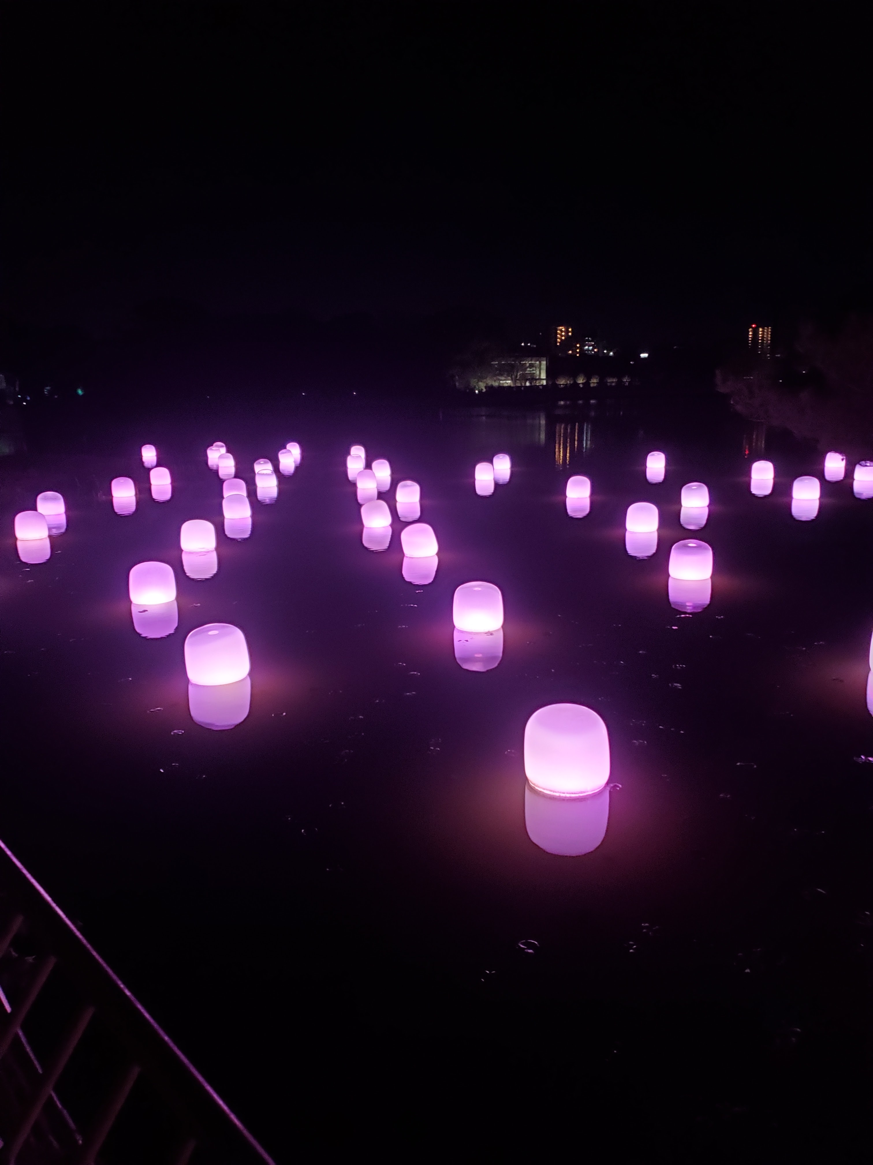 TeamLab is an organization that puts up funky immersive art experiences throughout Japan. This one was located in the Nagai Botanical Gardens. Once it was dark enough they opened the gates and the guests poured in. The pieces were spread out but there were five groupings with very specific names, for instance, Forest of Autonomous Resonating Life, Universe of Fire Particles in the Forest, Resonating Microcosms Solidified Light Color. New Age music followed us through the exhibits and it was synchronized with the light show.
