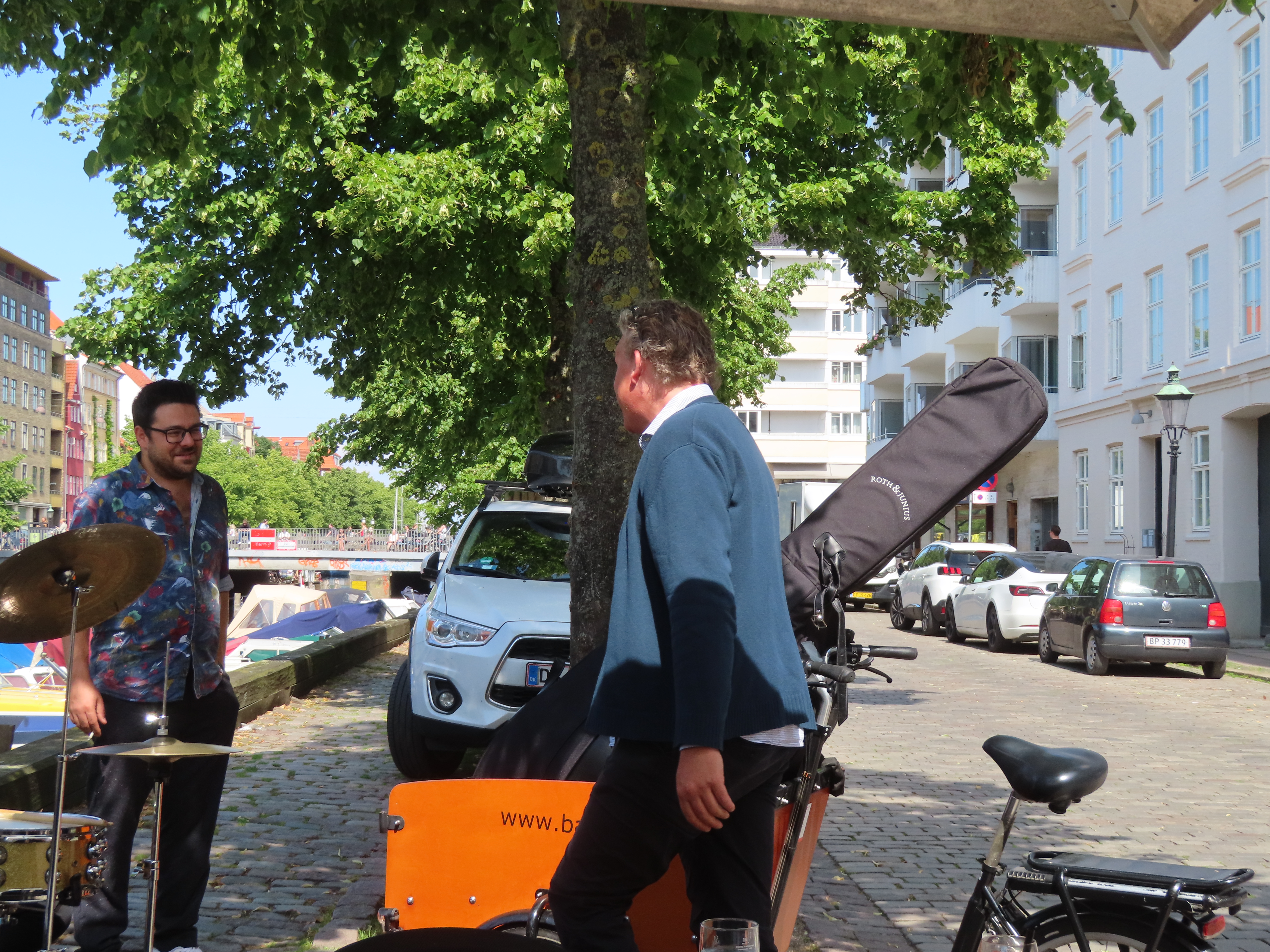 Today the sun was out in force so the Jazz took a back seat to people watching. Today's themes include types of bicycles, interesting outfits, shirtless boaters and street art. First we headed to Christiana for a quick tour where we saw some net graffiti. Then back to Sofi's Kitchen for a Jazz Trio. This band was Daniel Franks Trio and of all the bands we have seen so far these guys were our least foavrite. They did not seem to have their hearts in it. They started late, had to conference between songs and took an early and extended break between sets. Oh well, the people watching made up for all that. We were on the canal again so we got to see all the boats going by. We also got to see every form of bicycle ride on by as well as some sort of traveling sport team stream down the street with all their luggage.