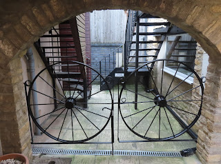The most unusual item seen today was a biplane, disassembled and towed behind a car. We saw unusually large groups of dogs, horses sharing the street with trucks and cars, odd gates and manhole covers. That sums up our day with the possible exception of getting flu shots, booking accommodations in Sri Lanka and booking an airport shuttle in Australia. Oh, and the Stinky Bishop Cheese was also a bit odd.