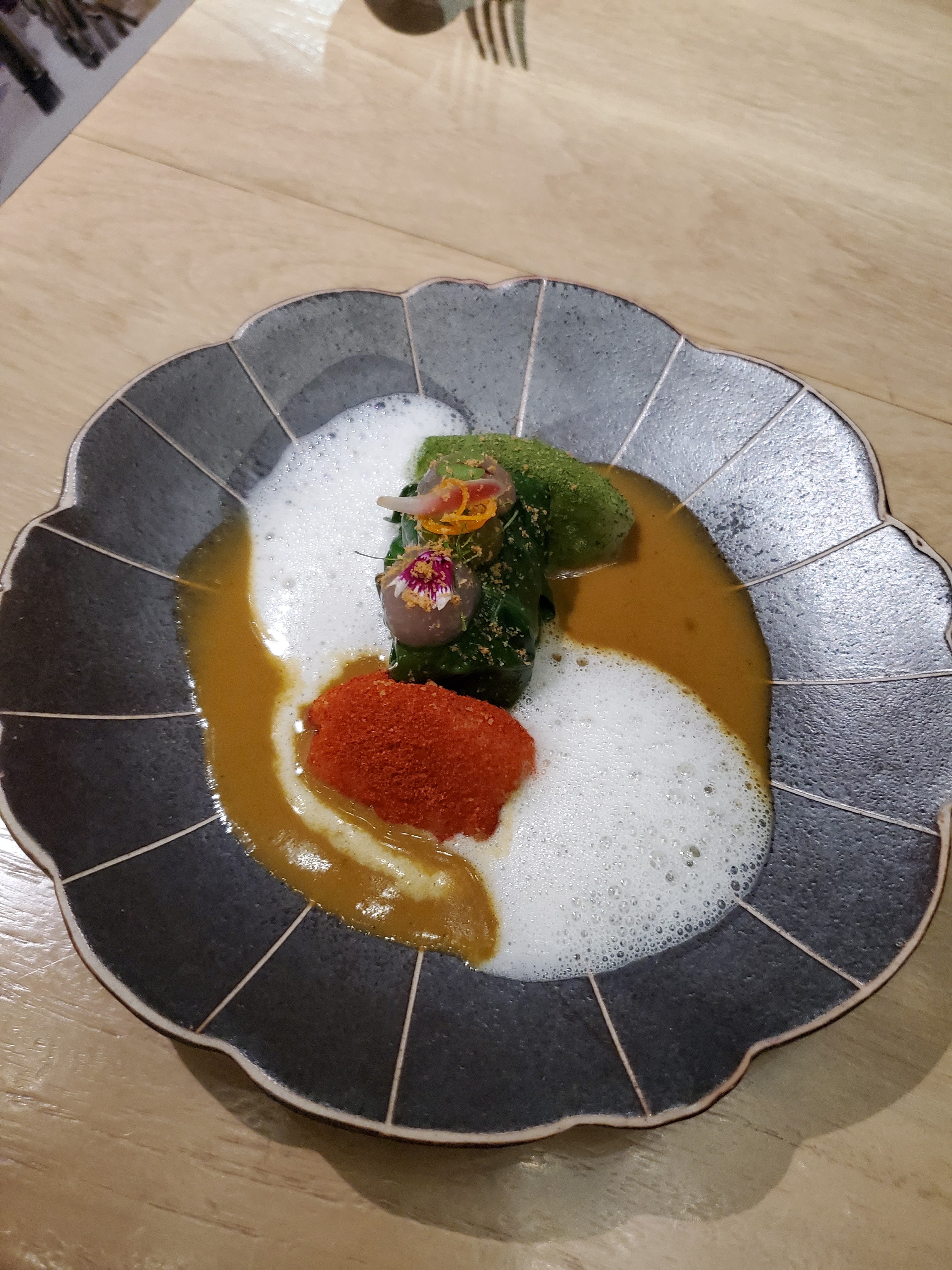 Our menu came out as an illustration as seen above. We had 6 courses and ordered the fresh water prawn in addition. The courses were not too small so we were feeling nicely full as the dinner progressed. We were also shown a basket of ingredients that represented our meal as it was sourced from the local vendors. The food was brilliant: aged duck , wagyu beef, squid, crabs, fermented tofu, pork and fermented pork. Le Du for two.